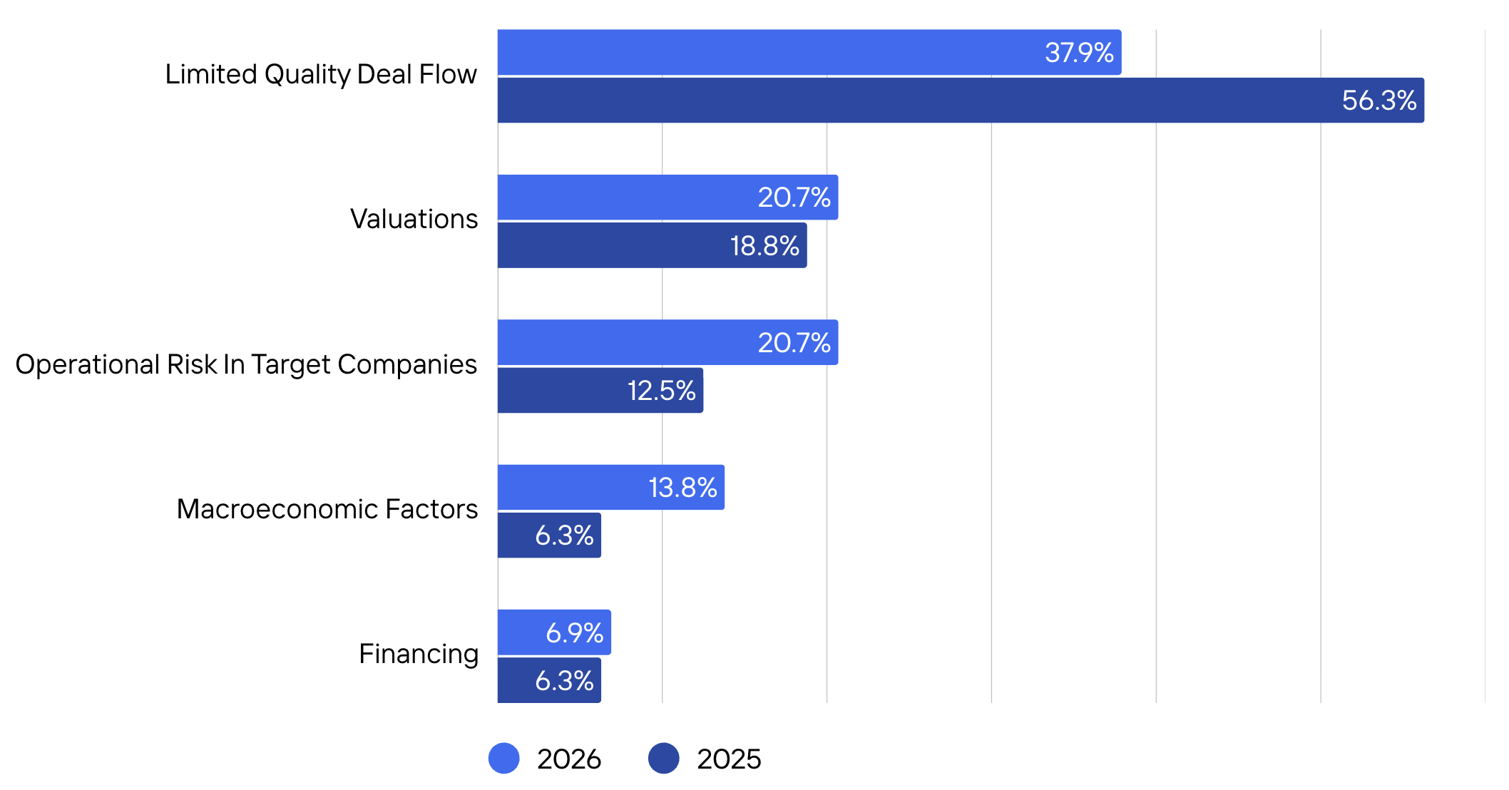 At the same time, other challenges are becoming more pronounced. Concerns around operational risk (20.7%, up from 12.5%) and macroeconomic factors (13.8%, up from 6.3%) have increased, suggesting investors are shifting focus from simply finding deals to underwriting them more carefully. Valuations remain a consistent consideration, while financing constraints appear relatively stable.