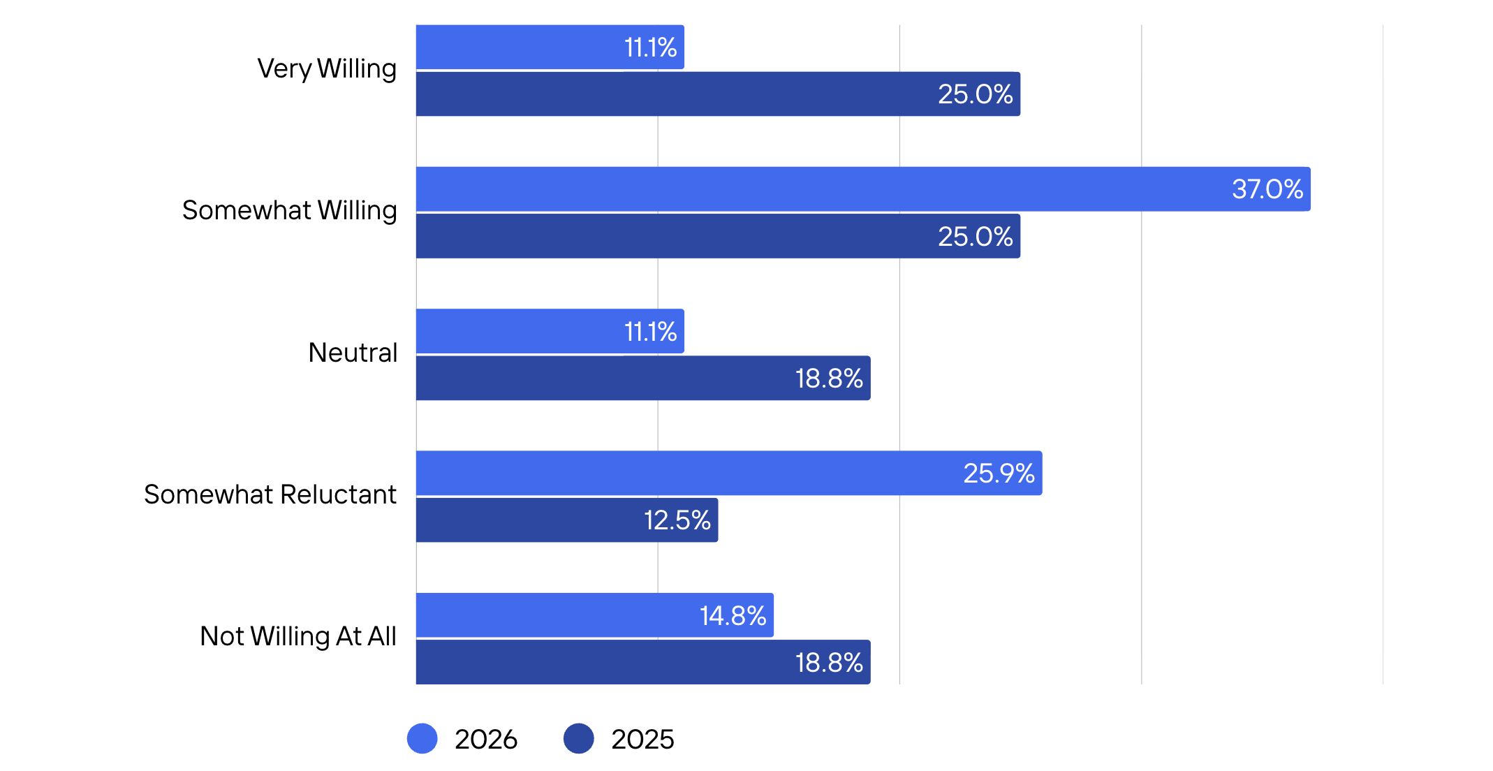 At the same time, reluctance has risen. 25.9% of buyers are now somewhat reluctant (up from 12.5%), signaling a shift toward more disciplined underwriting, even for high-quality opportunities.