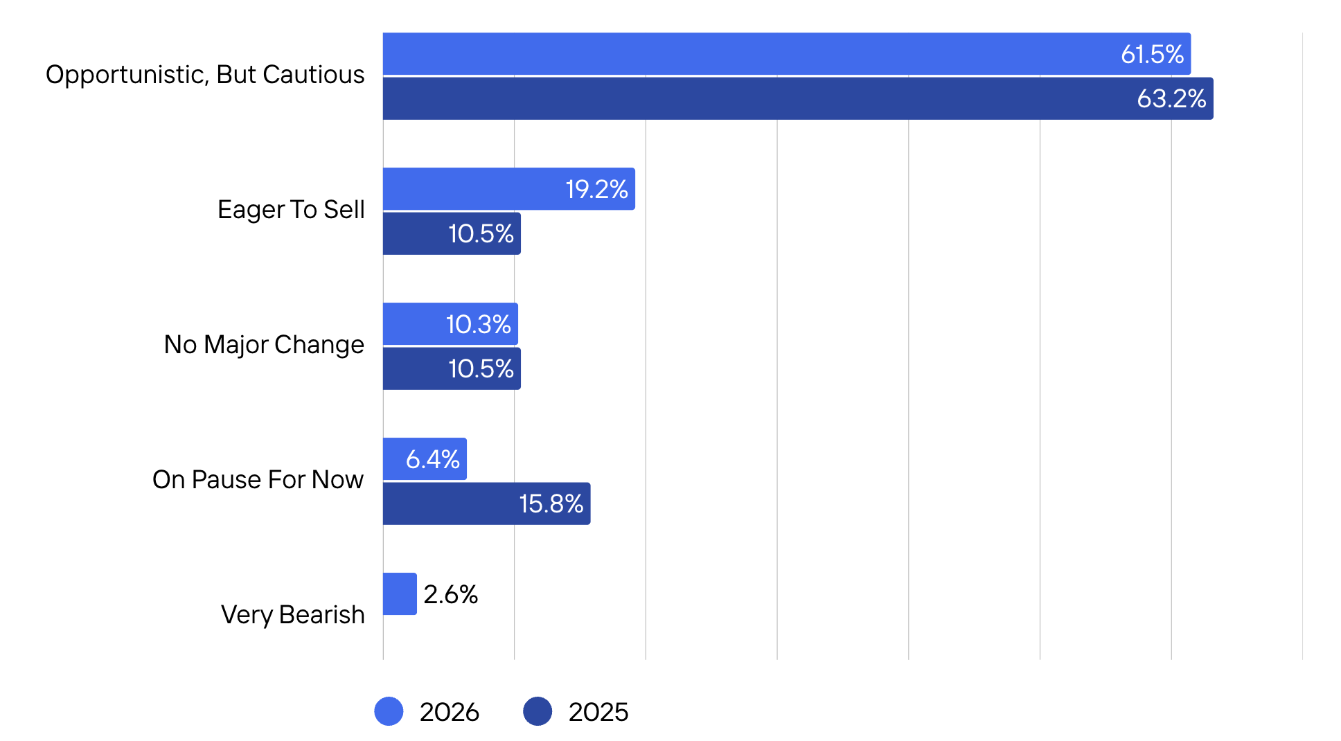 Seller sentiment continues to be “opportunistic, but cautious,” cited by 61.5% of advisors in 2026, roughly in line with 63.2% in mid-2025. Notably, fewer sellers are pausing processes (6.4% vs. 15.8% in mid-2025), while the share of eager sellers has increased to 19.2% (from 10.5%).