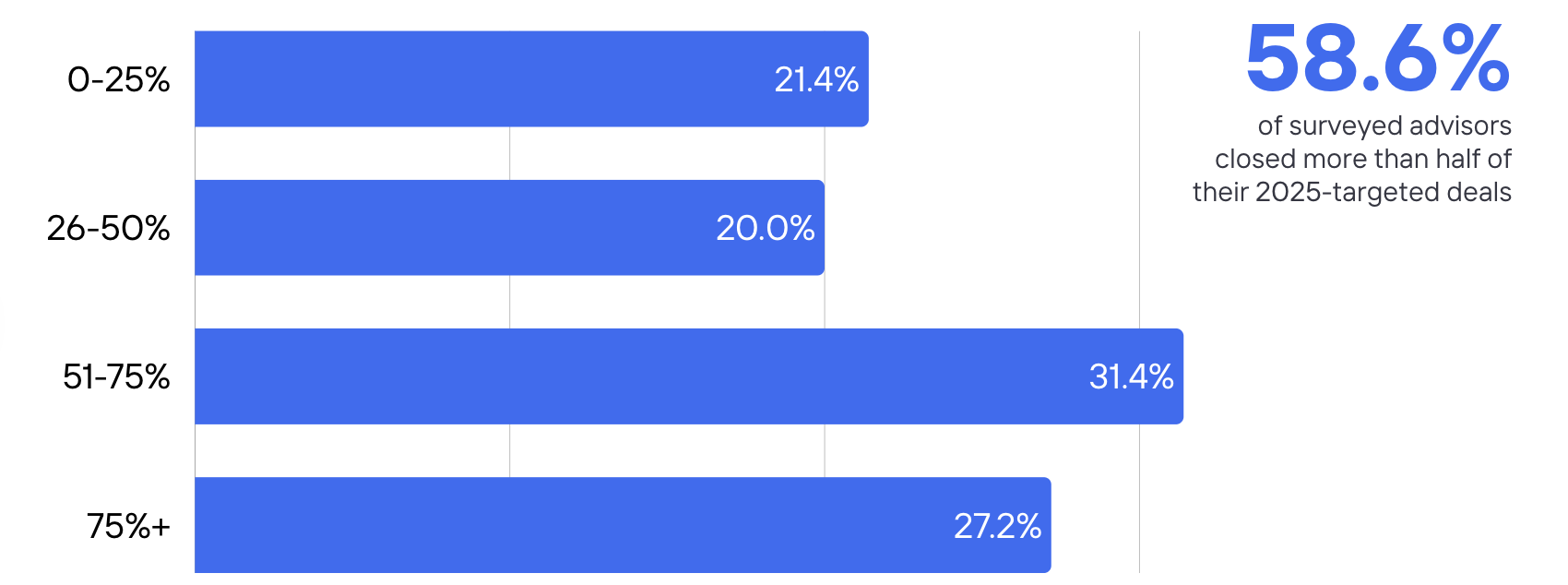 Looking back on 2025, 58.6% of advisors reported that more than half of their deals closed, including 27.2% who closed over 75% of processes. At the same time, 41.4% reported closing half or fewer of their deals, highlighting the continued execution challenges across the market.