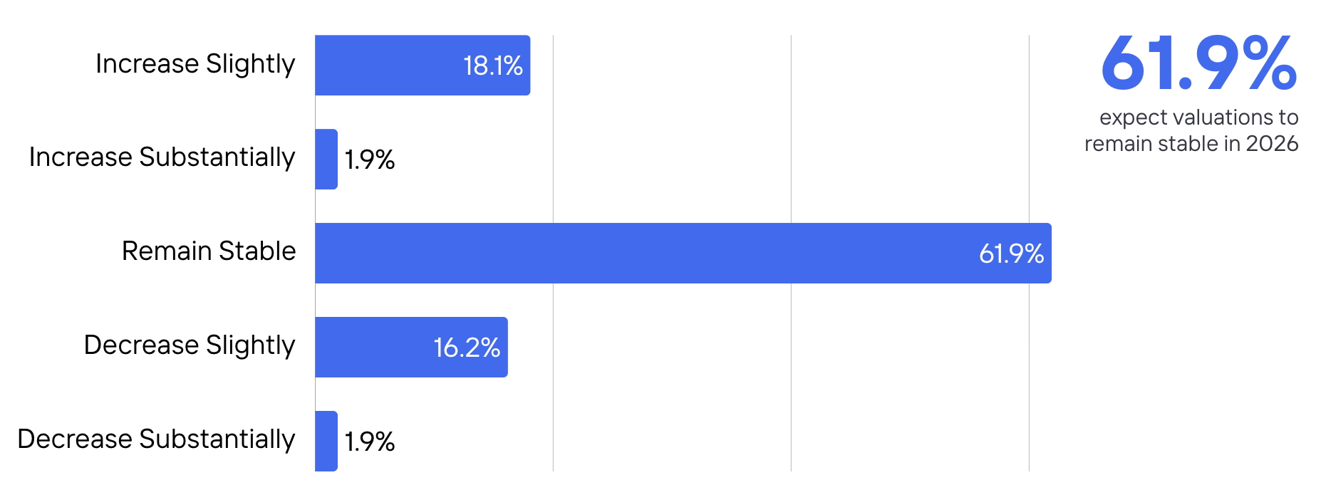 Most dealmakers expect valuation multiples to hold steady in 2026. A clear majority (61.9%) anticipate valuations will remain stable relative to 2025, while sentiment on directional movement is mixed—18.1% expect slight increases, and 18.1% expect slight decreases. Very few respondents expect more dramatic shifts in either direction.