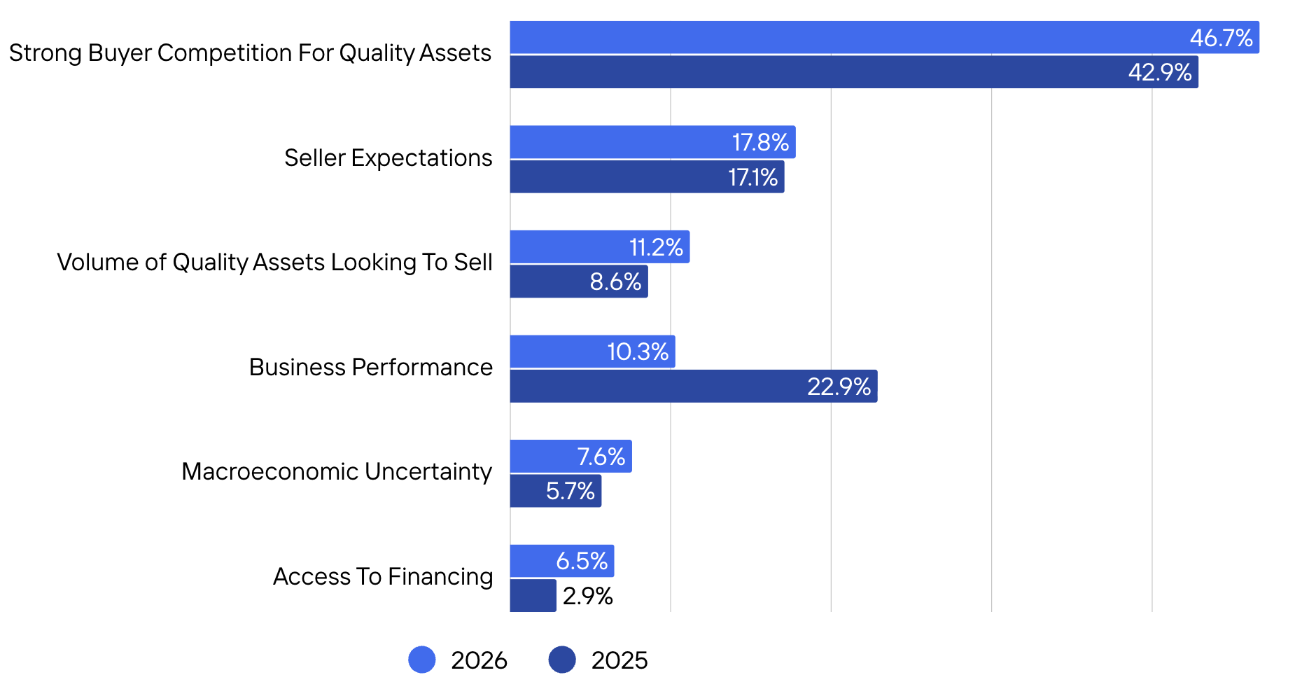 Surveyed Axial dealmakers point to strong buyer competition for quality assets as the primary driver of upward valuation pressure (46.7% in 2026, up from 42.9% in 2025). Meanwhile, macroeconomic uncertainty was again the most commonly cited factor applying downward pressure (39.4% vs. 42.4% in 2025), followed by business performance (31.7%, up from 24.2%). The responses suggest a market balancing optimism around high-quality opportunities with caution tied to external volatility and business performance.