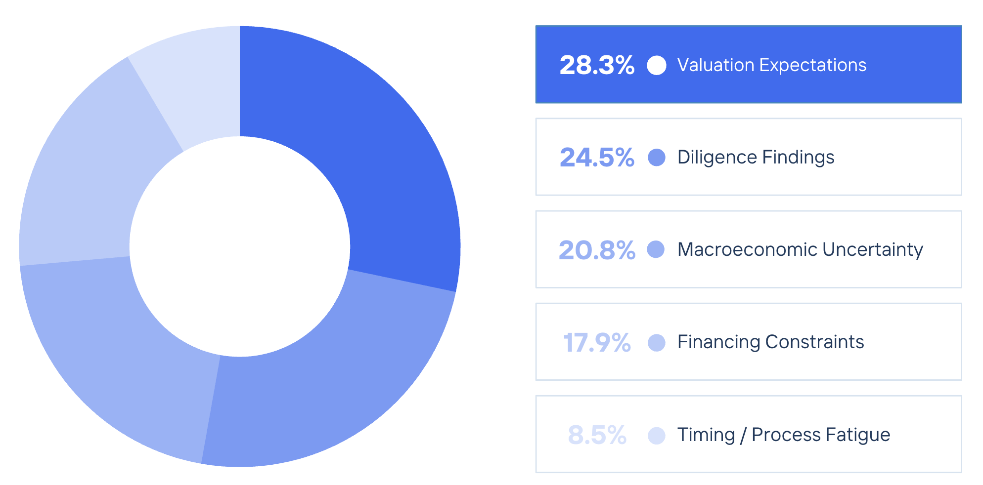 The leading cause of deal failures in 2025 was valuation expectations, cited by 28.3% of respondents, narrowly ahead of diligence findings (24.5%). Macroeconomic uncertainty (20.8%) and financing constraints (17.9%) also played significant roles, underscoring external pressures and challenges with capital availability. These factors appear throughout the survey and are further explored in the sections that follow.
