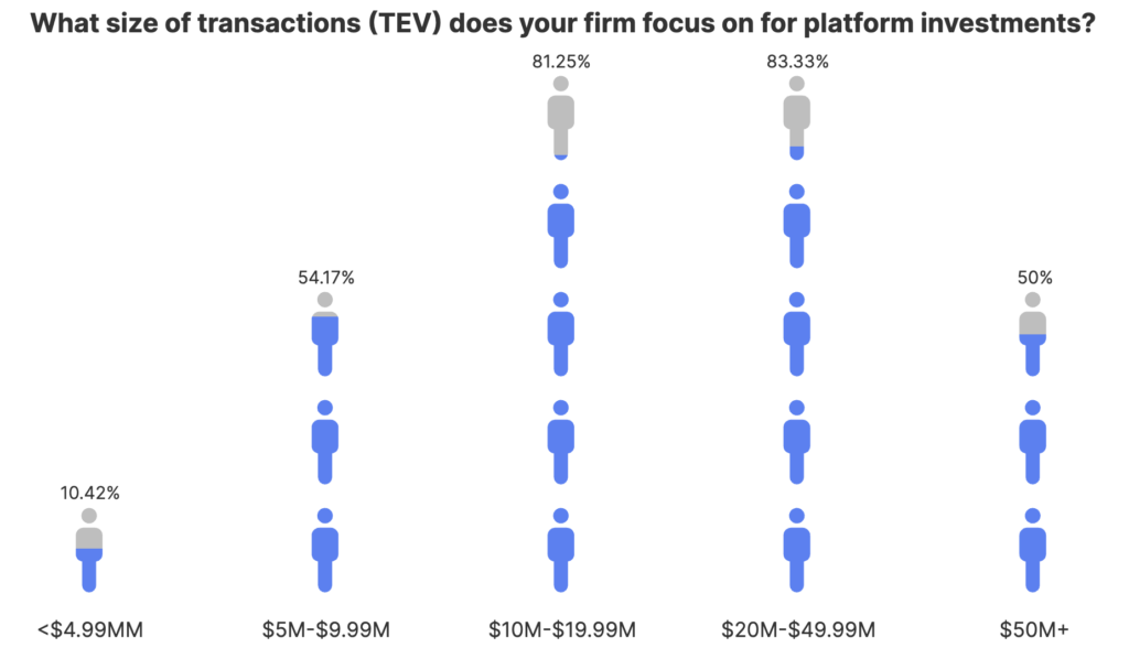 For platform investments, $5M-$50M serves as the broader range of interest for transaction size, and the $10M-$50M TEV threshold serves the optimal deal size with over 80% of Independent Sponsors indicating it as a range of focus for them.