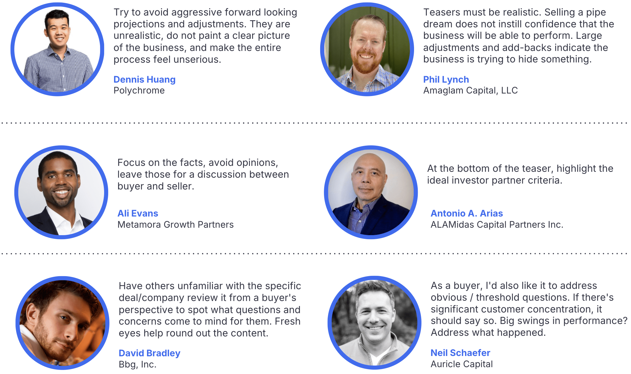 | Great teasers are short and to the point, but contain all the critical information to make a quick, preliminary decision as a buyer. Mathew Burpee, Kepler Capital Corporation |