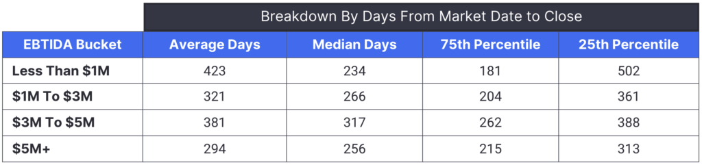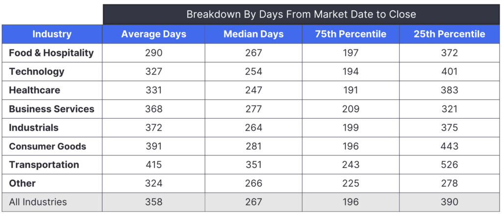 Axial platform data suggests that selling a business takes an average of 358 days. This varies by industry and financial profile—see the breakdown below.
