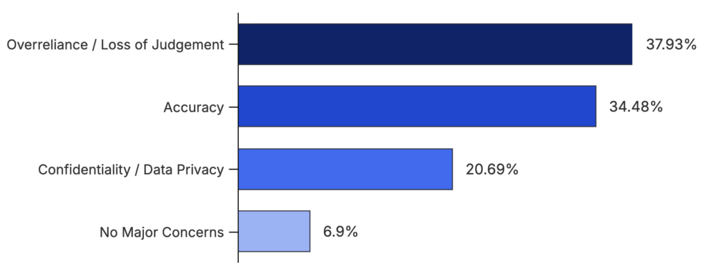 Accuracy followed closely at 34.48%, underscoring the importance of verifying AI-generated outputs, especially in high-stakes or data-sensitive contexts. Meanwhile, confidentiality and data privacy ranked third (20.69%), a likely reflection of the cautious approach M&A professionals take with sensitive information.