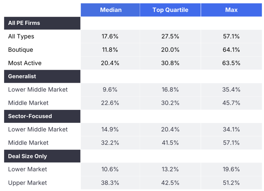 Private equity firms miss the majority of opportunities available in the market. According to Sutton’s annual Private Equity Deal Origination Benchmarking Report (snapshot below), PE firms, on average, cover less than 20% of relevant deal flow coming from lower middle market advisory firms. Even firms in the top quartile only reach 27.5%, and at the very best, market leaders max out at 57.1%.