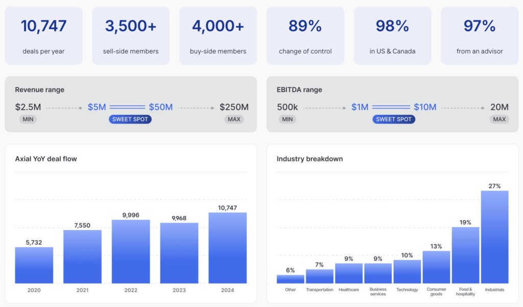 Private equity investors turn to Axial to expand their coverage of relevant deal flow from lower middle market boutique investment banks and business brokers. Some quick stats on the platform: