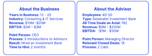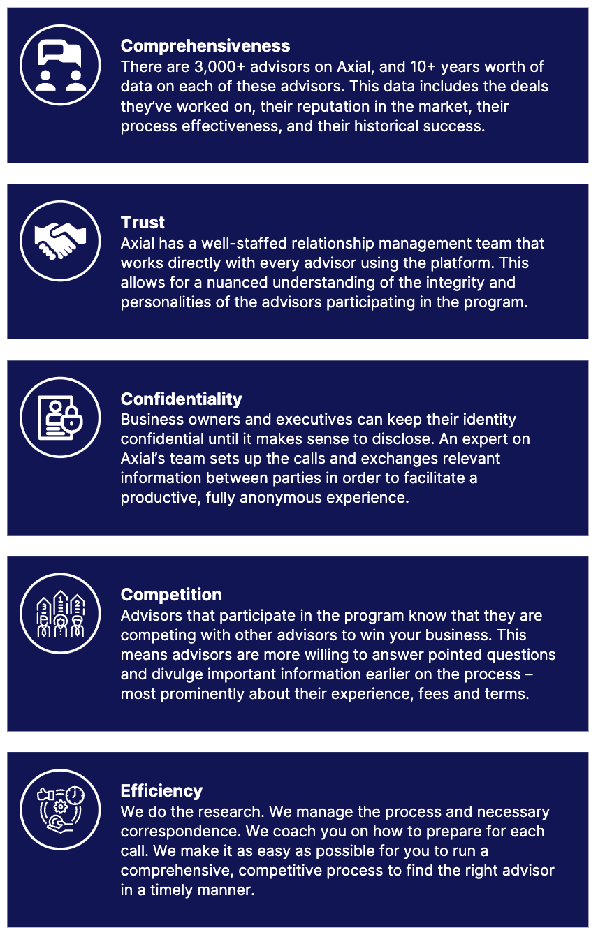 Axial’s Advisor Finder program provides curated introductions of relevant M&A advisors to business owners exploring a sale. There are thousands of advisors that actively market their engagements on the Axial platform, which allows business owners to get as close as possible to running a comprehensive search. Beyond comprehensiveness, they are able to do so efficiently and with minimal time commitment.