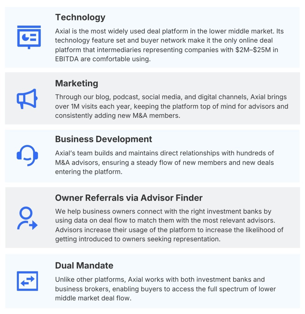 Axial has one primary promise to private equity investors on its platform: maximize coverage of relevant deal flow coming from lower middle market boutique investment banks and business brokers.