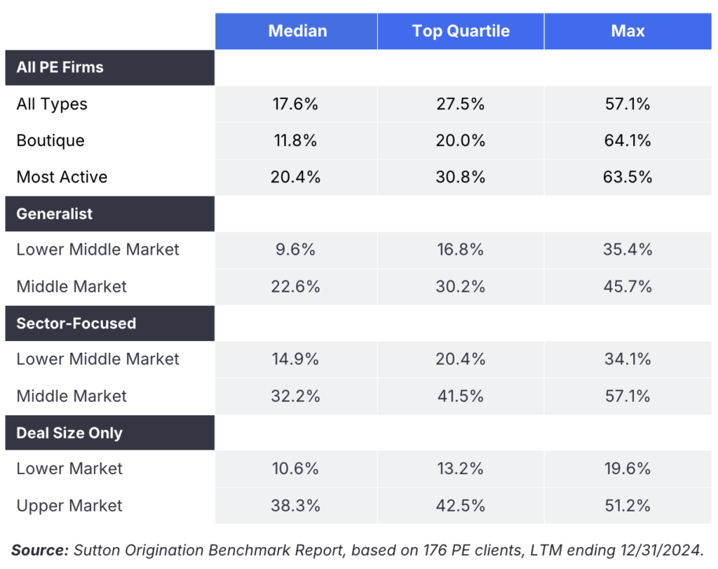 The most active private equity firms are only sourcing a small portion of relevant opportunities available in the market. According to the Report, the median PE firm covers just 17.6% of its relevant deal flow. Even firms in the top quartile only reach 27.5%, and at the very best, market leaders max out around 57.1%.