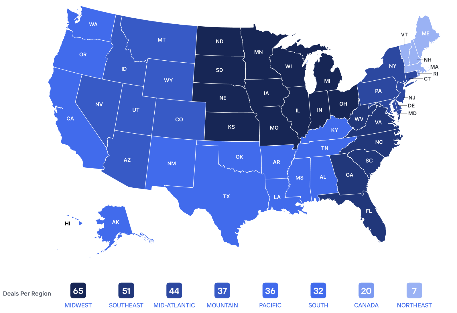 This edition highlights key data points from the transactions, including deal headline, industry, revenue, EBITDA, and the number of Axial buyer matches. It also provides a broader breakdown of deal activity by industry, along with a regional heat map of business locations.