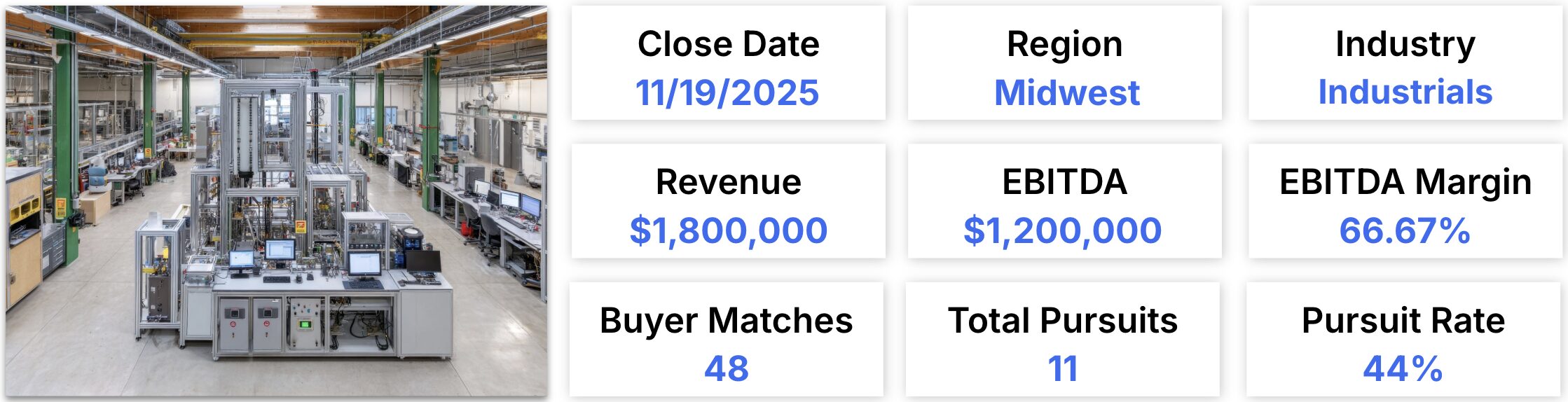When the deal was confidentially brought to market via the Axial platform in Q2 2025, it received 48 recommended buyer matches. The advisor shared it with 25 of those buyside members, 11 of whom pursued the opportunity, resulting in a strong 44% pursuit rate.