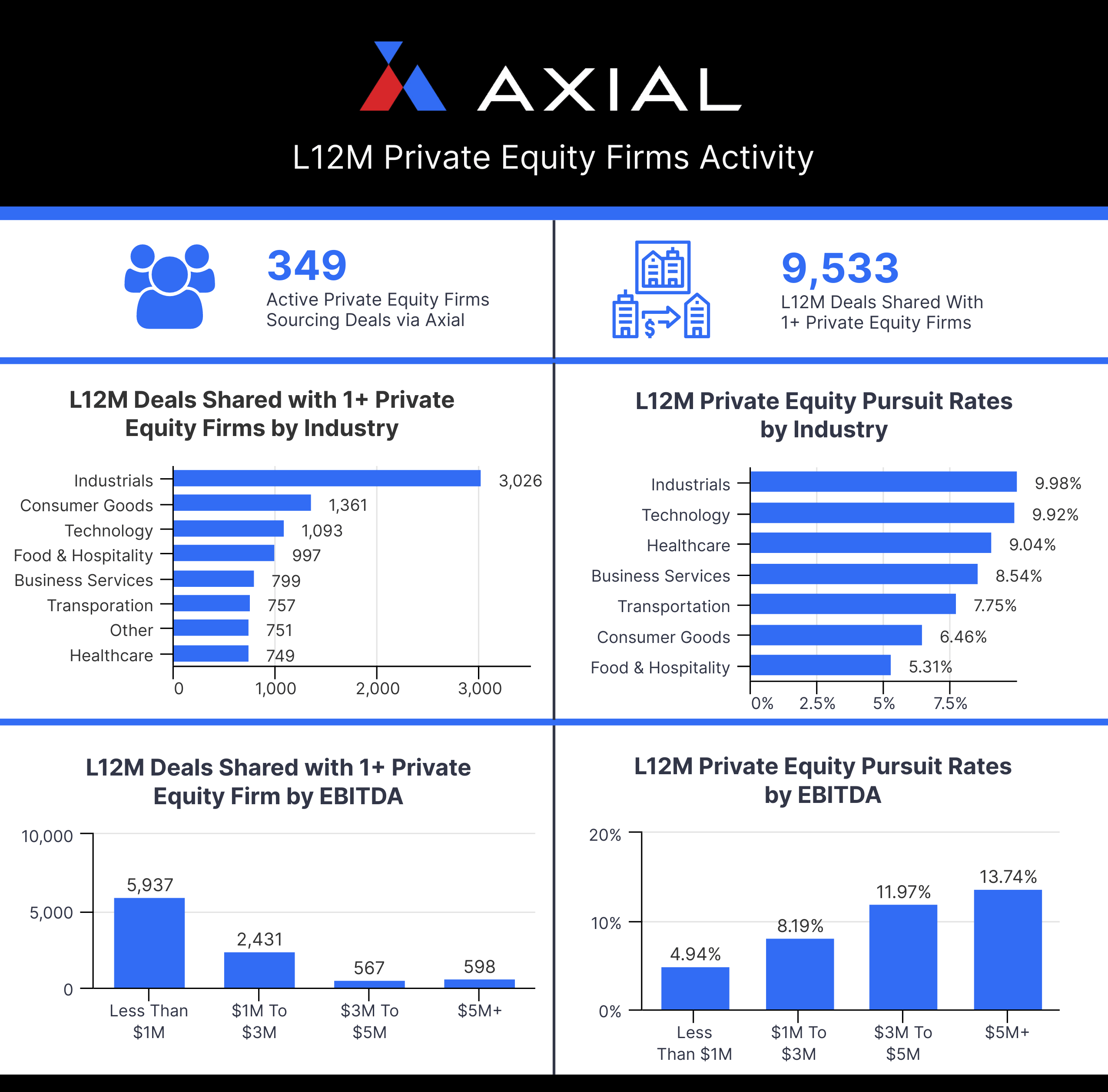 Axial’s Private Equity Firm ranking is assembled based on the deal-making activities of 349 Private Equity Firms and is driven by three factors: