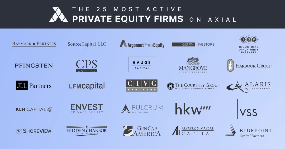 Today we are featuring the 25 Most Active Private Equity Firms on the Axial platform. This is the third installment of our buyside ranking series. Select the images below to review the lists for Independent Sponsors and Family Offices from 2023.