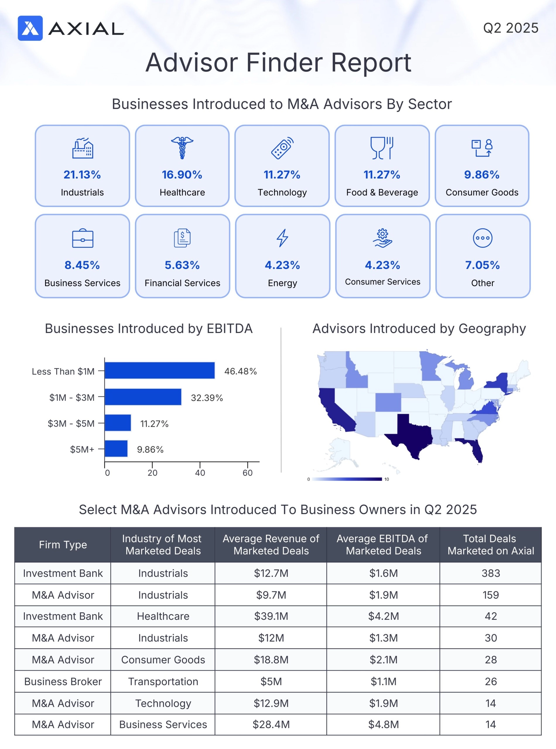 Below, we have created a set of tear sheets that outline a complete breakdown of Advisor Finder activity in Q2 2025. All data is fully anonymized to protect the confidentiality of the owners and advisors. Feel free to share and incorporate the data into your materials as you see fit.