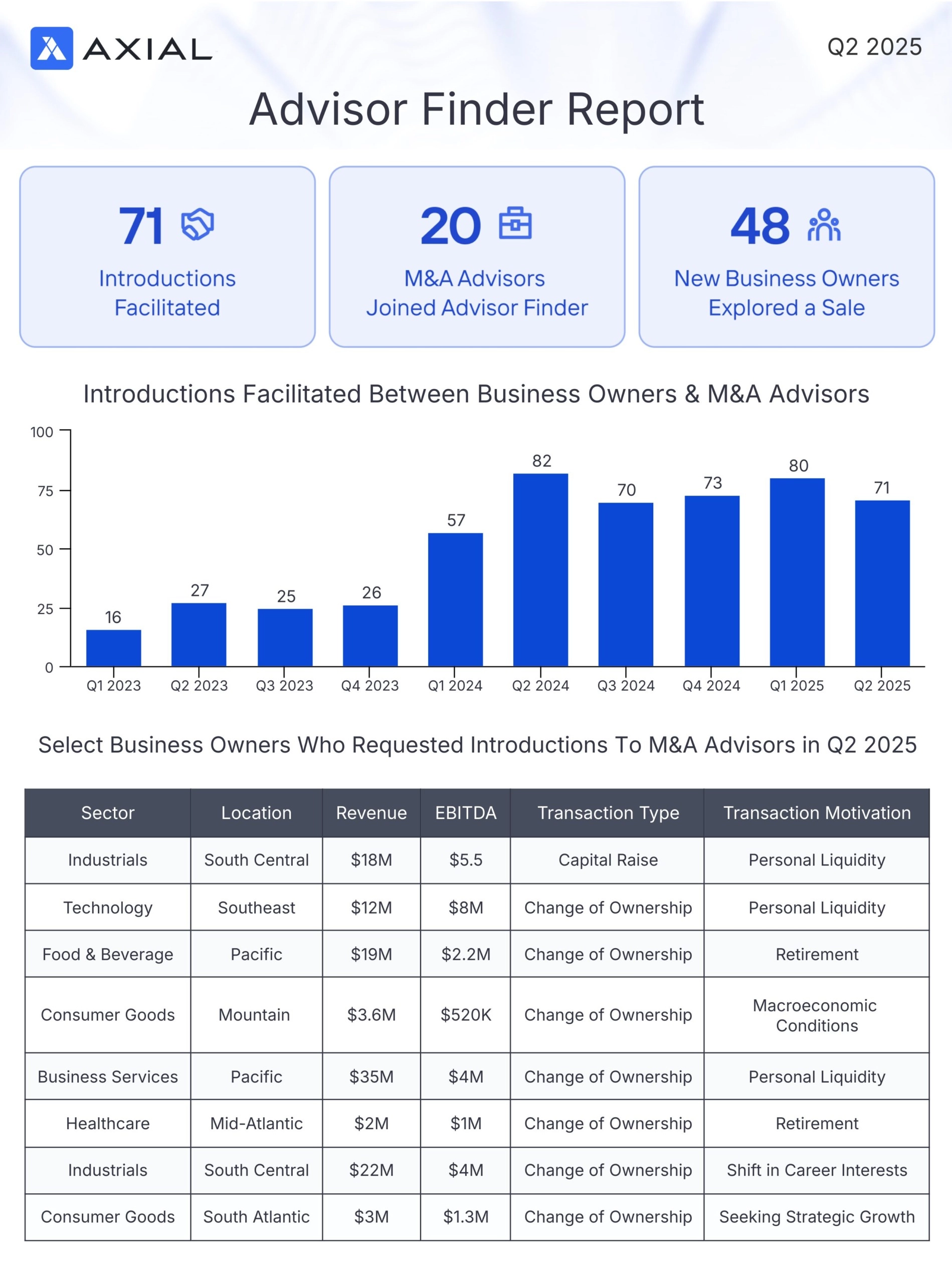 Last quarter, 48 business owners explored a sale or capital raise through Axial, and 20 new M&A advisors joined the Advisor Finder program. There were 71 introductions facilitated between business owners and advisors, bringing the total number of introductions for the year to 151. This marks an 8.63% increase compared to the first half of 2024 and represents the fifth consecutive quarter with at least 70 introductions.